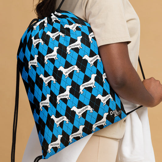Dachshund Argyle Blue and Black Drawstring bag