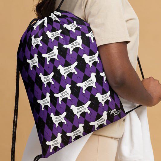 Golden Retriever Argyle Purple and Black Drawstring bag