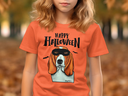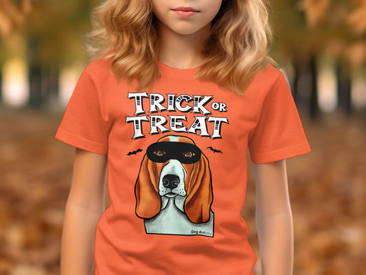 Basset Hound Wearing Mask Trick or Treat Halloween Funny Kid’s T-Shirt