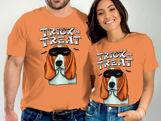 Basset Hound Wearing Mask Trick or Treat Halloween Funny Unisex T-Shirt