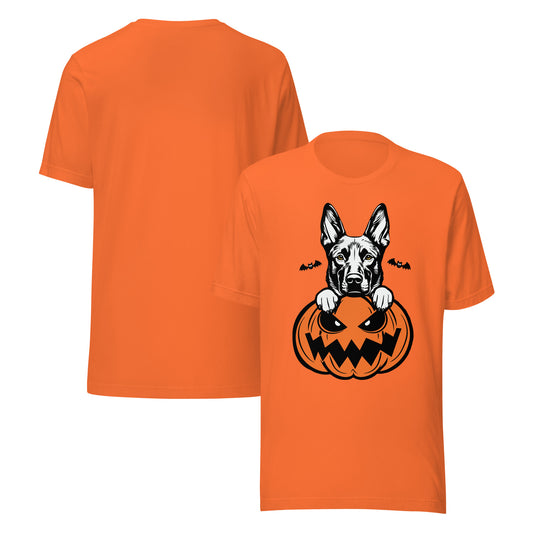 Belgian Malinois Dog Peeking Halloween Pumpkin Unisex T-Shirt by Dog Artistry