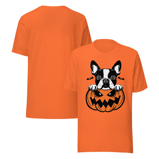 Boston Terrier Dog Peeking Halloween Pumpkin Unisex T-Shirt by Dog Artistry