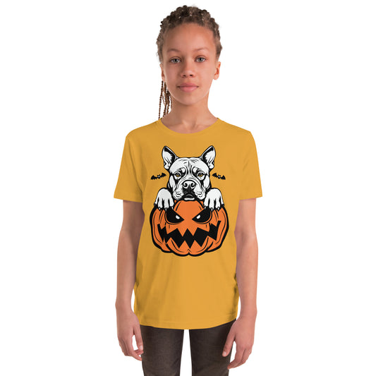 American Bully Dog Peeking Halloween Pumpkin Unisex Youth T-Shirt by Dog Artistry