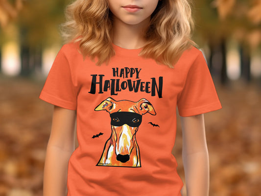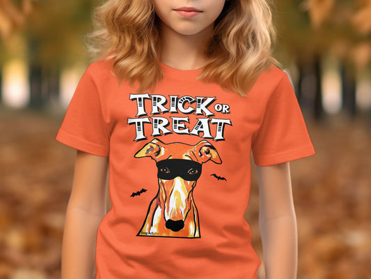 Greyhound Whippet Wearing Mask Trick or Treat Halloween Funny Kid’s T-Shirt