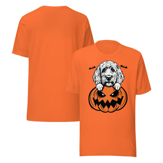Goldendoodle Dog Peeking Halloween Pumpkin Unisex T-Shirt by Dog Artistry