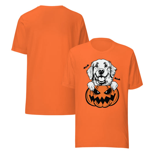 Golden Retriever Dog Peeking Halloween Pumpkin Unisex T-Shirt by Dog Artistry