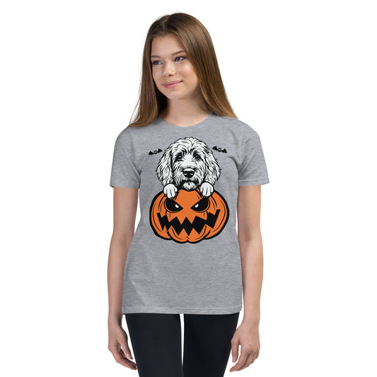 Goldendoodle Dog Peeking Halloween Pumpkin Unisex Youth T-Shirt by Dog Artistry
