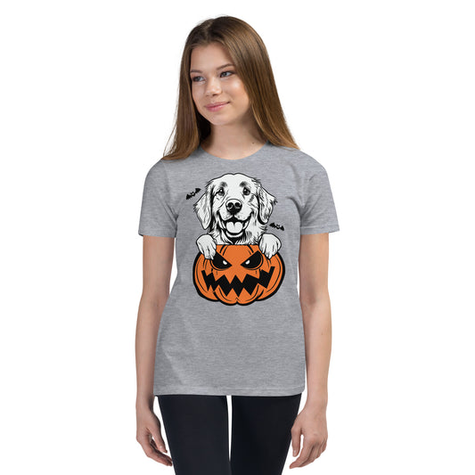 Golden Retriever Dog Peeking Halloween Pumpkin Unisex Youth T-Shirt by Dog Artistry