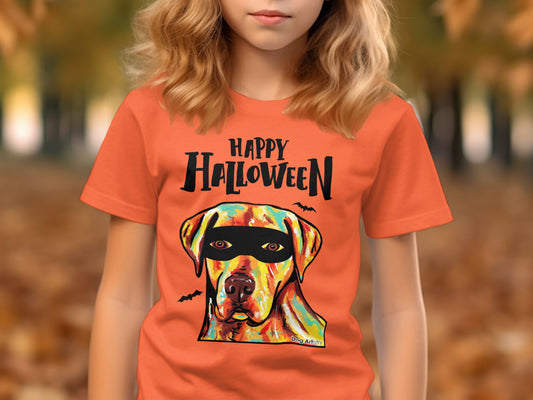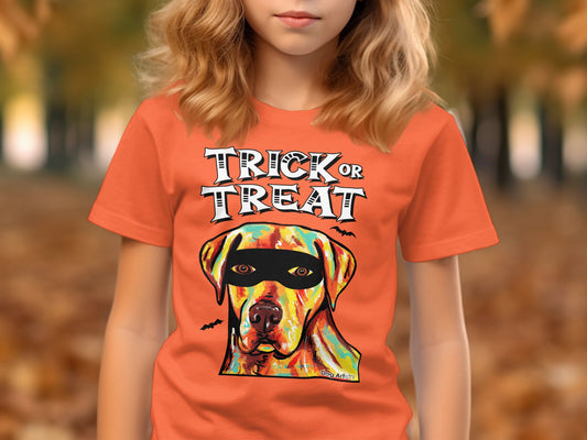 Labrador Retriever Wearing Mask Trick or Treat Halloween Funny Kid’s T-Shirt
