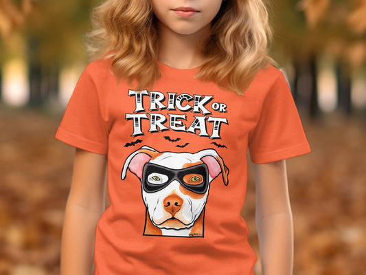 Pit Bull Amstaff Wearing Mask Trick or Treat Halloween Funny Kid’s T-Shirt