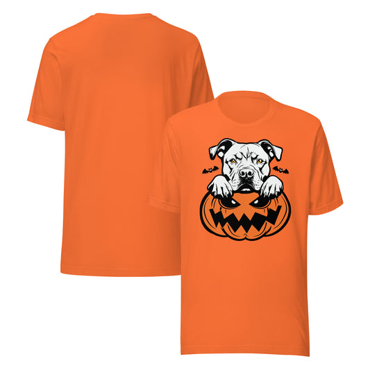 Pit Bull Dog Peeking Halloween Pumpkin Unisex T-Shirt by Dog Artistry