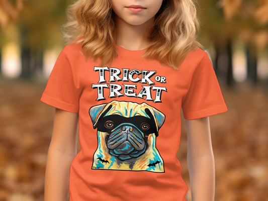 Pug Wearing Mask Trick or Treat Halloween Funny Kid’s T-Shirt