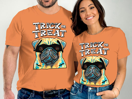Pug Wearing Mask Trick or Treat Halloween Funny Unisex T-Shirt