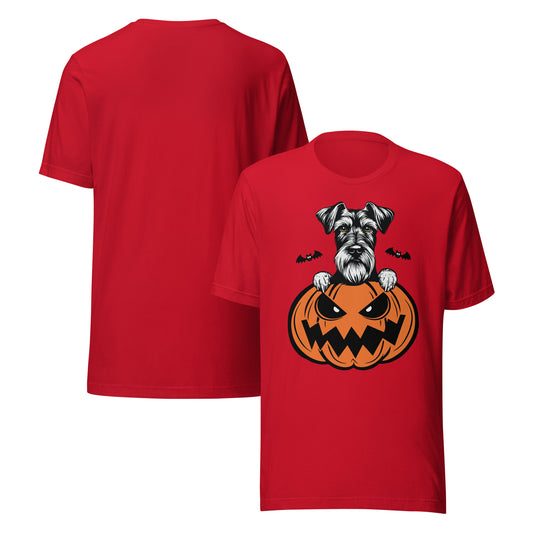 Schnauzer Dog Peeking Halloween Pumpkin Unisex T-Shirt by Dog Artistry