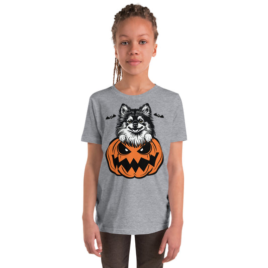 Pomeranian Dog Peeking Halloween Pumpkin Unisex Youth T-Shirt by Dog Artistry