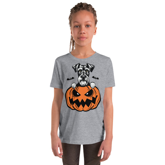 Schnauzer Dog Peeking Halloween Pumpkin Unisex Youth T-Shirt by Dog Artistry