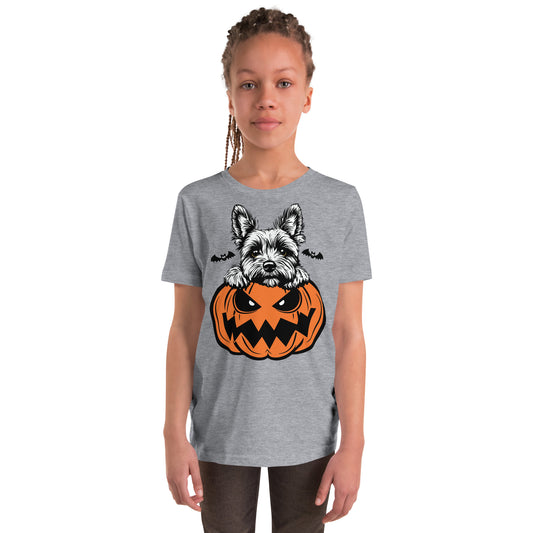 Yorkie Dog Peeking Halloween Pumpkin Unisex Youth T-Shirt by Dog Artistry