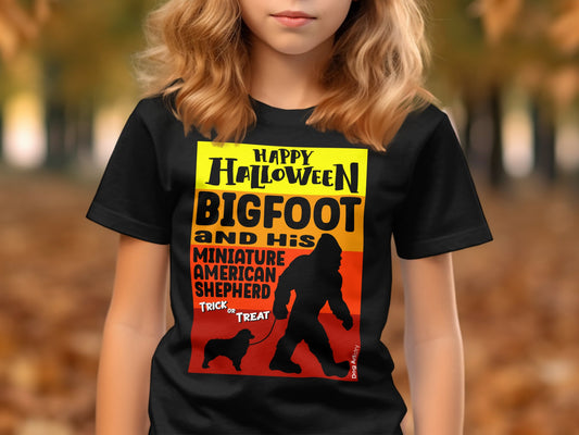 Happy Halloween Bigfoot and His Miniature American Shepherd Trick or Treat Funny Kid's T-Shirt