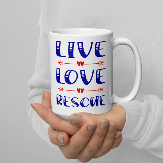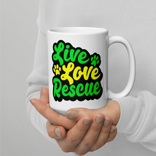 Live Love Rescue Glossy White Mug (Green and Yellow Imprint)
