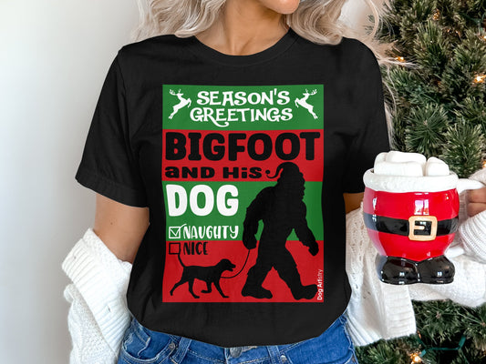 Season's Greetings Bigfoot and His Dog Naughty or Nice Christmas Funny Unisex T-Shirt