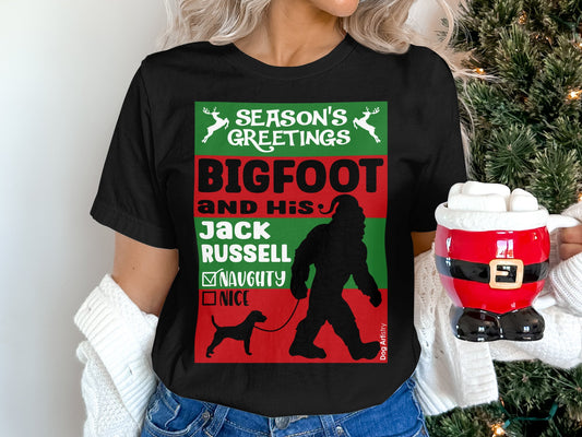 Season's Greetings Bigfoot and His Jack Russell Naughty or Nice Christmas Funny Unisex T-Shirt